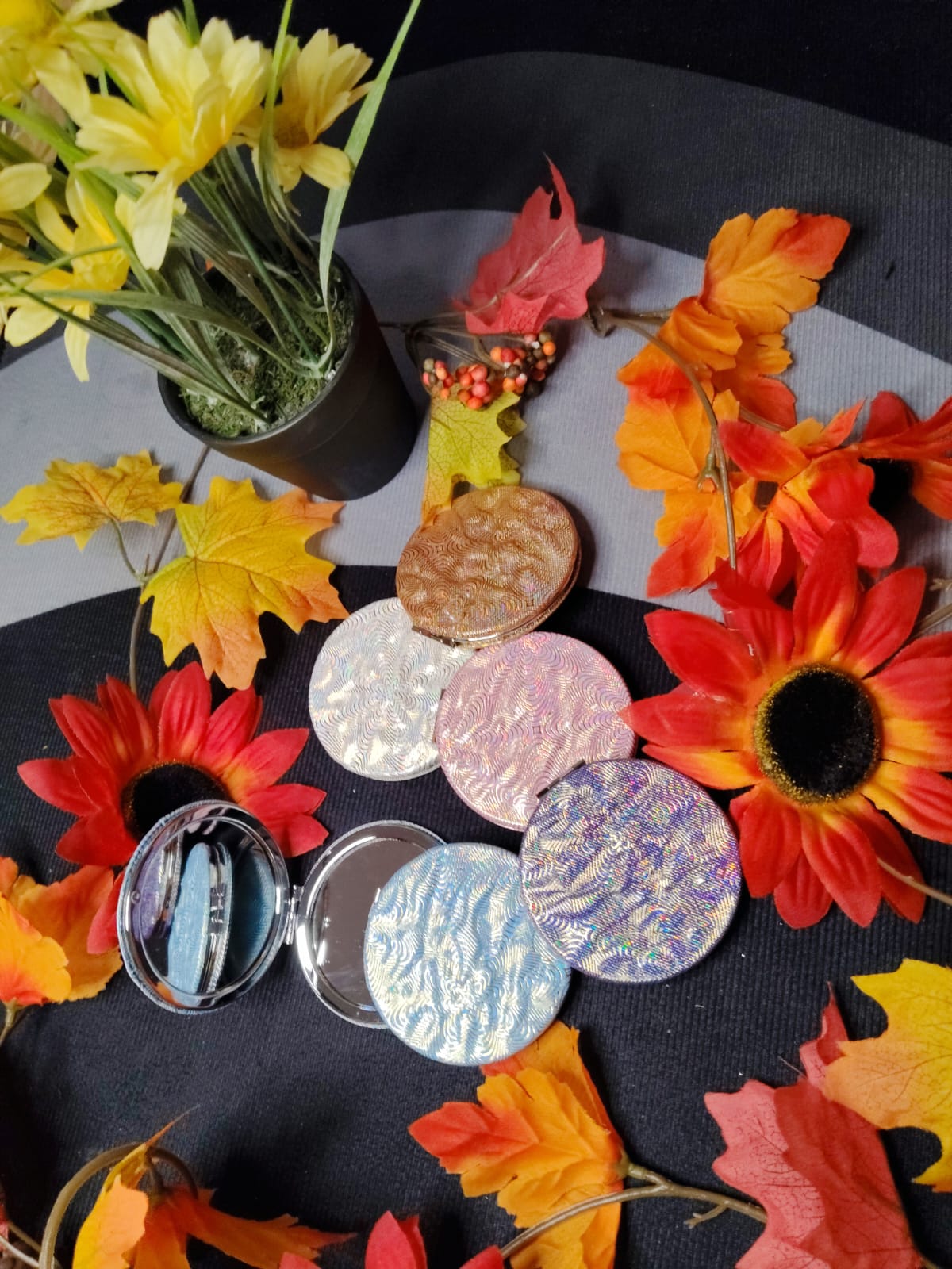 ESPEJO COMPACTO IRIDISCENTE CON AUMENTO – DISEÑO TEXTURIZADO Y PORTÁTIL